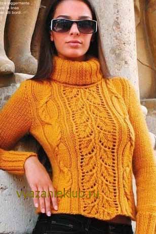 Модель свитера для женщин выполнена узором из кос и ажурным узором из "листиков" пряжей из шерсти. Вязание спицами для женщин с описанием, см. далее.