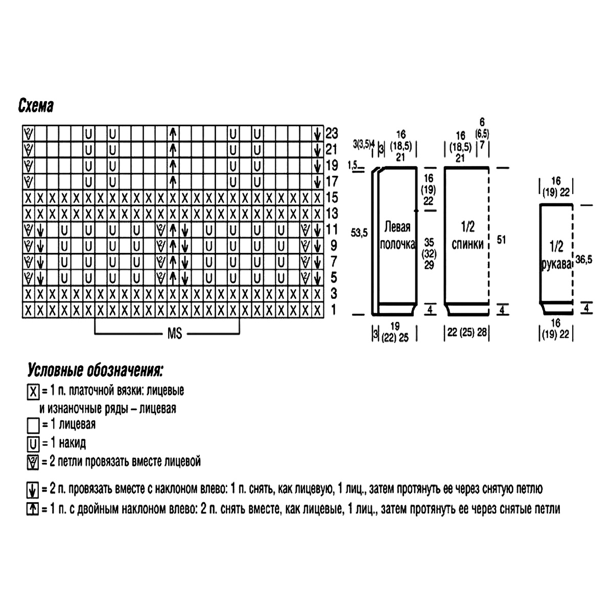 Плотность вязания: узор 2 — 20 п. х 24 р. = 10 х 10 см; планка — 6 п. узора 3 + 1 кромочная = 3 см.