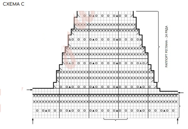 Продолжайте работать по схеме C делая регланные убавки, как указано (чередуя убавки то во 2м , то в 4м рядах). Повторяйте до тех пор пока не свяжете то же количество рядов, что и для спинки.