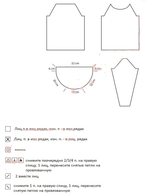 Спицами 4 мм, начиная от переднего левого регланного шва наберите петли вдоль выреза горловины как показано на рисунке ниже: 20 пет по левому плечу, 13 пет по центральным закрытым петлям, 20 пет по правому плечу, 6 пет по рукаву, 32 пет по спинке, 6 пет по рукаву.