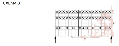 Далее работайте по схеме A. Вяжите первую петлю лицевой в каждом лицевом ряду, данная петля не указана в схеме.