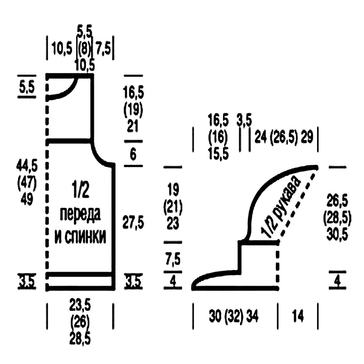 Перед. Вязать как спинку, но через 11 см = 24 р. (13,5 см = 30 р.) 15,5 см = 34 р. от начала последовательности узоров закрыть для горловины среднюю 31 п. и обе стороны закончить раздельно.
