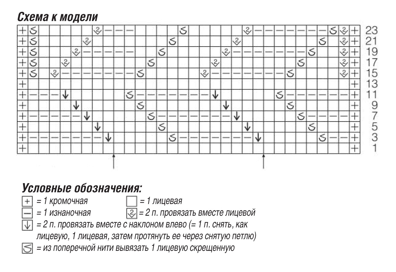Узор 4: структурный узор (число петель кратно 14 + 2 + 2 кромочные) = вязать согласно схеме. На ней даны только лицевые ряды; в изнаночных рядах петли провязывать по рисунку. Начать с петель перед правой стрелкой, постоянно повторять раппорт из 14 п. между стрелками и закончить петлями после левой стрелки. Постоянно повторять 1-24-й р.