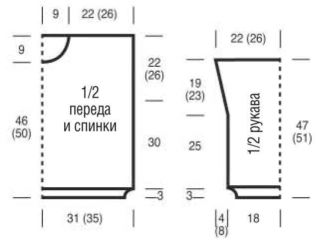 Перед: вязать, как спинку, но через 43 см = 104 р. (47 см = 112 р.) от нижней планки закрыть для горловины средние 14 п. и обе стороны закончить раздельно.