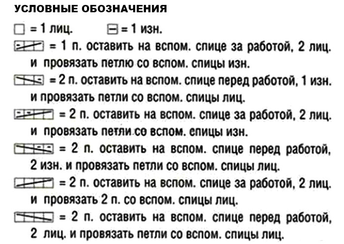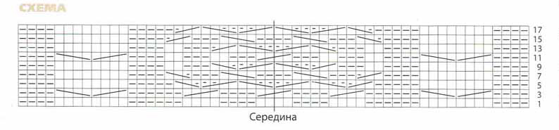 Узор из кос (ширина 56 п.): вязать по схеме, на которой приведены лиц. р., в изн. р. петли вязать по рисунку. Выполнить 1 раз с 1-го по 17-й р., повторять с 3-го по 17-й р.