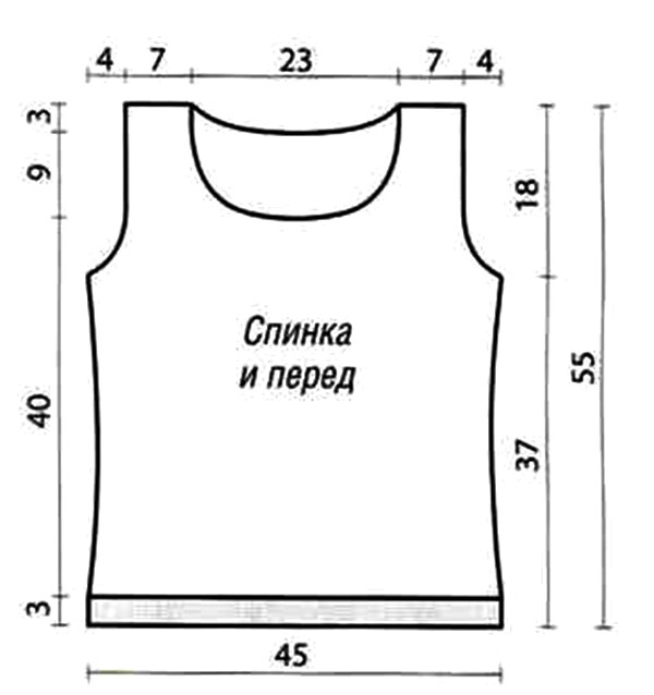 Спинка: на спицы № 7 набрать 78 п. и связать между кром. 3 см резинкой 2/2. прибавив в последнем ряду 2 п. = 80 п. Затем вязать лиц. гладью, убавляя для приталивания с обеих сторон в каждом 8-м р. 2 х 1 п., в каждом 10-м р. 2 х 1 п., для этого с правой стороны вязать 1 кром., 1 лиц., провязать 2 п. вместе лиц.; с левой стороны 1 протяжка (снять 1 п. как лиц., 1 лиц. и протянуть её через снятую петkю), 1 лиц., 1 кром. Затем прибавить в каждом 8-м р. 4 х 1 п. = 80 п. Через 37 см от наборного края закрыть для пройм с обеих сторон в каждом 2-м р. 1 х 3, 1 х 2 и 2 х 1 п. = 66 п. Через 52 см от наборного края закрыть для выреза горловины средние 28 п. и обе стороны закончить раздельно.