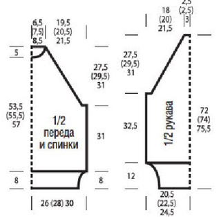 Через 31 см = 72 р. от нижней планки закрыть с обеих сторон для регланных скосов 1 х 3 (4) 5 п., затем подчеркнуто убавить в каждом 4-м р. 0 (2) 5 х 1 п. и в каждом 2-м р. 31 (28) 25 х 1 п. Оставшиеся 28 (34) 38 п. закрыть для горловины через 58,5 см = 134 р. (60,5 см = 140 р.) 62 см = 142 р. от нижней планки.