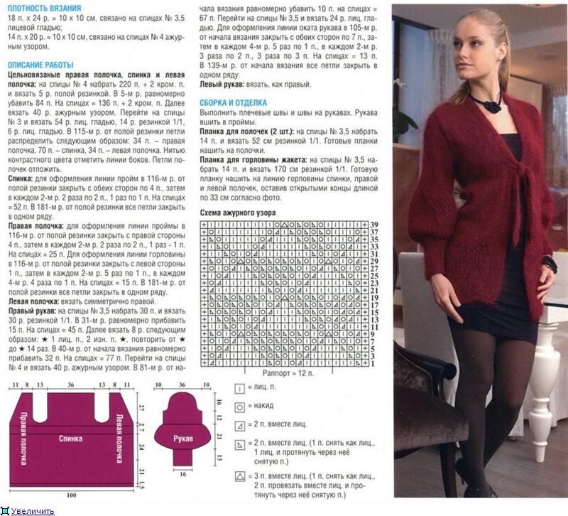 Жакет выполнен из Троицкой пряжи "Лада" бордового цвета (65% мохер; 25% шерсть; 10% акрил 120м/50г) на спицах 4 мм. Описание представлено на размеры 46/48